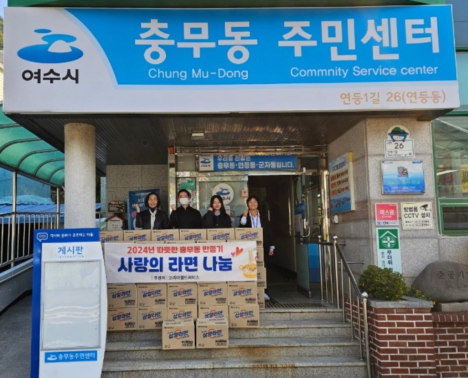 | 코리아월드써비스㈜(대표 김완식)는 지난 12일 충무동 취약계층의 따뜻한 겨울나기를 위해 충무동 주민센터에 500만 원 상당의 라면 200박스를 전달했다. |
