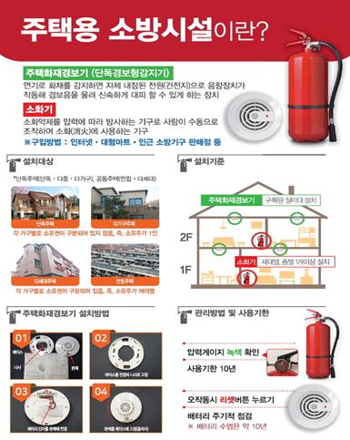 현행 ‘소방시설 설치 및 관리에 관한 법률’ 제10조에 따라 단독주택, 연립주택, 다가구주택(아파트 및 기숙사 제외)에는 단독경보형 감지기를 각 실(침실, 거실, 주방 등)마다 천장에 설치하고, 소화기는 세대별 또는 층별로 1개씩 구비해야 한다.