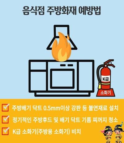 ▲주방 배기 덕트에 0.5mm 이상의 불연재 강판을 설치하여 화재 확산을 막기 ▲정기적으로 주방 후드와 배기 덕트의 기름 찌꺼기 청소를 통해 화재 위험 요인을 제거하기 ▲주방용 K급 소화기를 비치하여 기름 화재에 신속하게 대응하기 등이다.