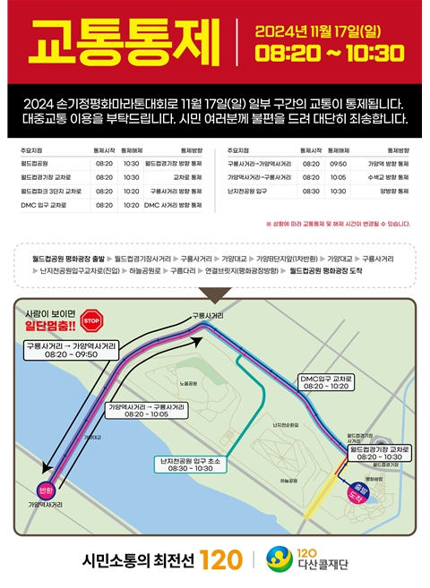 대회 당일 17일 오전 8시 20분부터 오전 10시 30분까지는 안전한 대회 운영을 위해 월드컵경기장 사거리, 구룡사거리, 가양대교 등 마라톤 주요 구간의 단계별 교통통제가 이뤄질 예정이다.