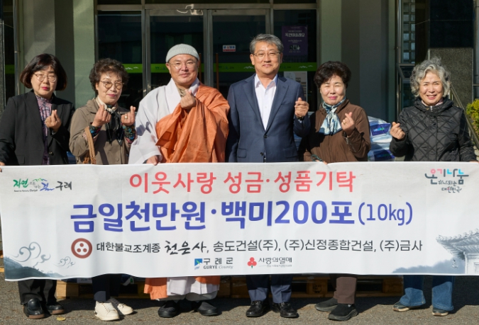 김순호 군수는 “매년 한결같이 어려운 이웃을 위해 나눔을 실천해 주시는 천은사에 깊은 감사를 드린다”며 “기탁해주신 성금과 백미는 소외된 이웃들에게 잘 전달해, 추운 겨울을 따뜻하게 보낼 수 있도록 하겠다”고 화답했다.