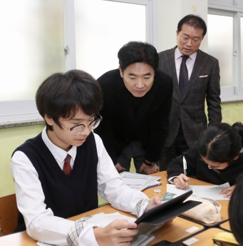 | 김대중 전남교육감과 관계자들이 공존교실 수업 현장을 참관하고 있다. |