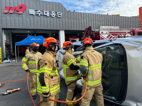 이번 훈련은 교통사고 차량 전복 등 특수상황을 재현해 차량 내 고립된 구조대상자에 대한 신속한 구조 등 인명구조 전문능력과 전기차 화재 대응 역량 강화를 위해 마련됐다.