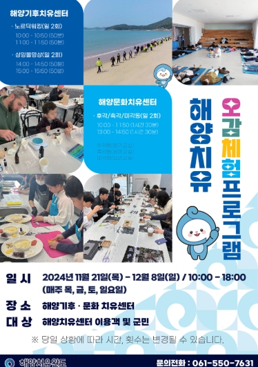 프로그램은 해양치유센터 이용객, 지역민 누구나 참여할 수 있으며, 이용 요금은 기후치유 소인 6,000원, 대인 10,000원, 문화치유는 소인·대인 20,000원이다.