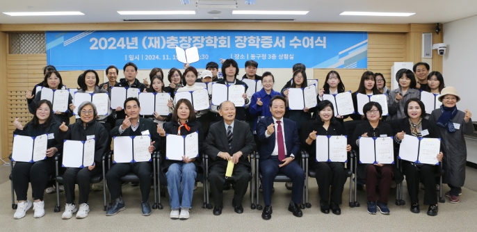 동구는 지난 19일 구청 상황실에서 열린 ‘2024년 충장장학회 장학 증서 수여식’에서 김백규 이사장의 사재 출연으로 관내 대학생 27명에게 개별증서와 함께 1인당 2백만 원씩 총 5천 4백만 원을 전달했다.