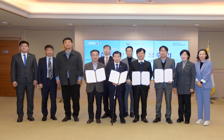 | 이상갑 광주광역시 문화경제부시장이 20일 오전 시청 비즈니스룸에서 열린 국민권익위원회 주관 더샵광주포레스트 유출지하수 고충민원 해결 조정회의에 참석해 조정서에 서명한 후 기념촬영을 하고 있다. (사진 왼쪽부터 김상훈 더샵광주포레스트 입주자대표회장, 유철환 국민권익위원장, 이상갑 문화경제부시장, 김명준 ㈜포스코이엔씨 CS실장) /광주광역시 제공 |