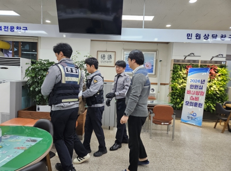 이번 훈련은 행정안전부 민원인의 위법행위 대응 방안 지침에 따라 ▲민원인 폭언·폭행 발생 ▲민원인 진정 및 경고 ▲상급자의 지원 ▲사전 고지 후 휴대용 보호장비 녹화·녹음 ▲비상벨 호출 및 민원인 제지 ▲피해 공무원 격리와 방문 민원인 대피 ▲특이 민원인 제압 및 경찰 인계 순으로 진행됐다.