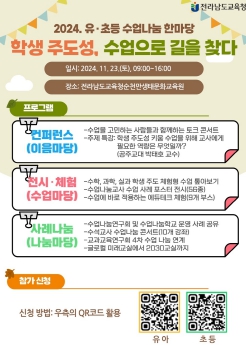 행사에서는 ‘학생 주도성 키움 수업을 위한 교사에게 필요한 역량’이라는 주제 강연을 비롯해 ▲ 유·초등 공감 토크 콘서트 ▲ 체험형 수업 톺아보기(16부스) ▲ 수업에 바로 적용하는 에듀테크 체험(9부스) ▲ 수업나눔연구회·학교, 연구학교 사례 나눔(18부스)등이 운영된다. 또한, ▲ 수업나눔교사 산물출 전시 ▲ 수석교사 수업나눔 콘서트(10교실) ▲ 전남교과교육연구회 4차 수업 나눔(5과목) ▲ 글로컬 미래교실에서 2030교실로(유·초) 등이 다채롭게 진행된다.