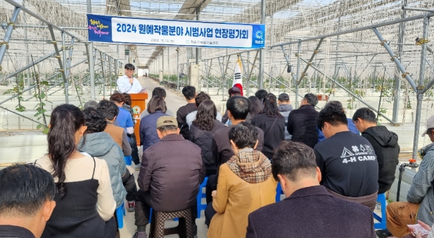 올해는 과수, 시설채소 분야 23개소, 57.4ha에 6개의 시범·실증사업이 추진됐으며, 이번 평가회는 2024년도 사업추진 결과 발표, 농가 사례발표, 시범사업 현장 평가, 농가 건의사항 청취 등으로 진행됐다.