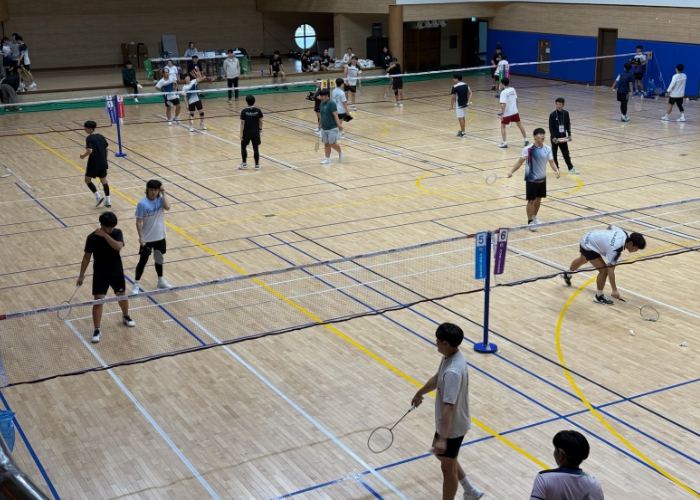 | 전국 대학 배드민턴 선수들이 강진 제2실내체육관에서 경기에 앞서 연습을 하고 있다. |