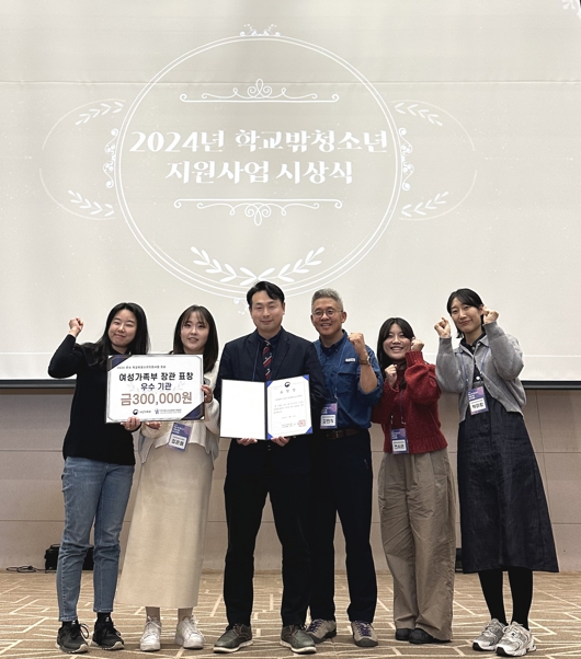 | 지난 21일 2024 유성구학교밖청소년지원사업 보고대회에 참석한 유성구학교밖청소년지원센터 관계자들이 장관상을 수상하고 기념촬영을 하고 있다. |