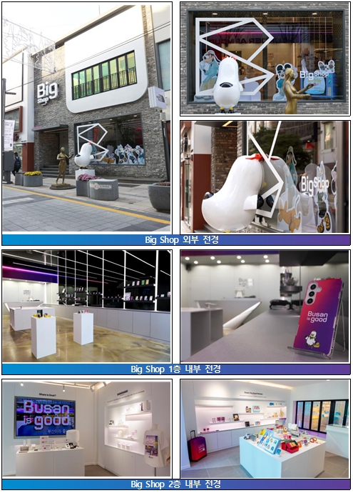 연면적 173.98제곱미터(㎡), 지상 2층 규모의 '부산 브랜드숍(Big Shop)'은 크게 ▲도시브랜드 체험·전시관(1층) ▲팬 상품(굿즈) 전시·판매장(2층)으로 구성된다.