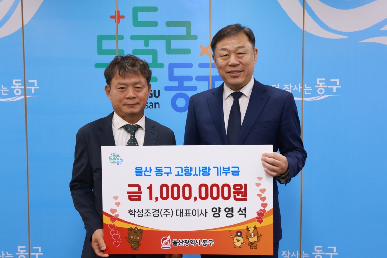 양영석 대표는 “고향사랑기부제라는 훌륭한 제도를 통해 울산 동구에 기부할 수 있어 기쁘다. 기부금이 지역발전에 의미 있게 쓰이기를 바란다”라고 전했다.