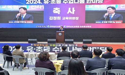 | 김정희 교육위원장이 11월 23일 2024년도 전남 유ㆍ초등 수업나눔 한마당에 참석하여 축사를 하고 있다. |