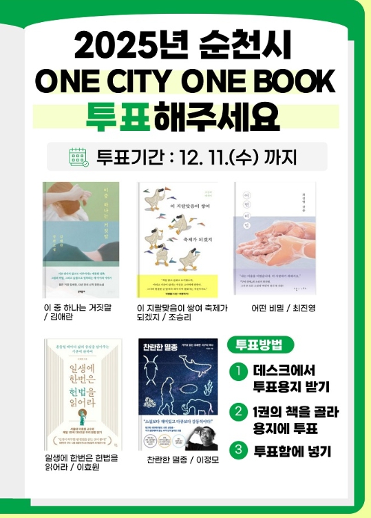 시 관계자는 “함께 읽고 토론하며 다양한 독서 프로그램을 즐길 수 있는 2025년 One City One Book을 선정할 수 있도록 많은 시민분들이 투표에 참여해 줄 것”을 당부했다.