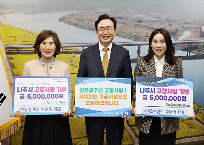 윤병태 나주시장은 “고향사랑기부제에 적극 동참해주신 두 대표님께 깊이 감사드린다”며 “기부금은 두 분의 따뜻한 마음과 뜻을 담아 주민 복리 증진과 나주시의 발전을 위해 적극 활용하겠다”고 말했다.