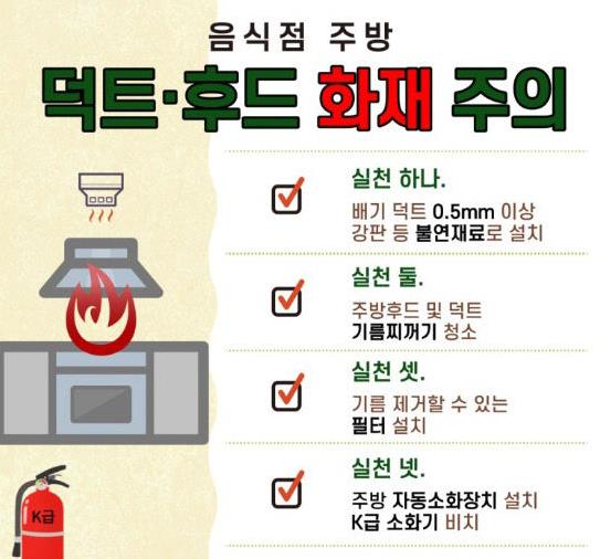 이를 예방하기 위해서는 ▲벽과 후드·덕트의 주기적인 청소를 통한 기름때 제거▲화기 주변 인화성 물질 두지 않기▲주방용 소화기(K급) 비치▲기름을 제거할 수 있는 필터 설치▲주기적인 환기 및 환기기구 정비 등이다.