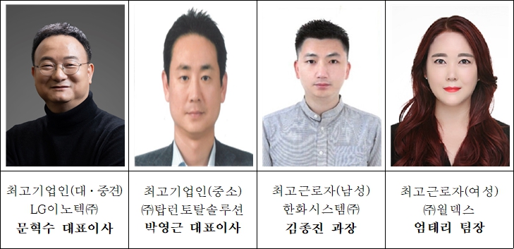 올해 최고기업인상은 대·중견기업 부문에서 LG이노텍㈜ 문혁수 대표이사가, 중소기업 부문에서는 ㈜탑런토탈솔루션 박영근 대표이사가 수상의 영예를 안았다. 최고근로자 부문에서는 남성 최고근로자에 한화시스템㈜ 김종진 과장, 여성 최고근로자에 ㈜월덱스 엄태리 팀장이 각각 선정됐다.