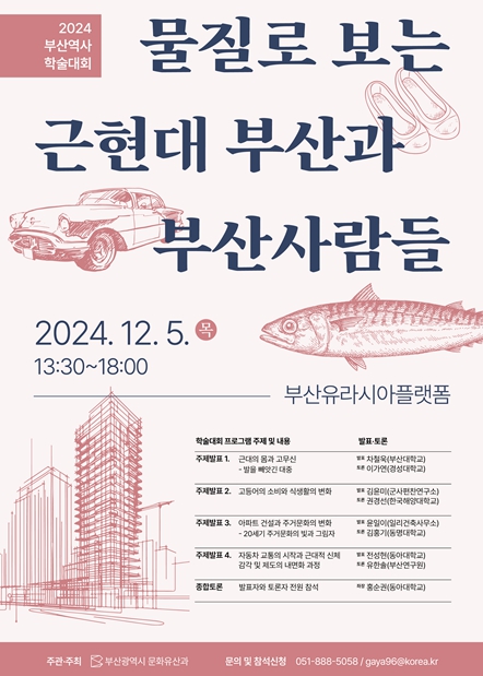 심재민 시 문화체육국장은 “이번 학술대회는 우리에게 익숙했던 물건이 언제 어떻게 도입돼 우리들의 삶을 변화시켰는지를 살펴보기 위해 마련됐다”라며, “고무신, 고등어, 아파트, 자동차 등의 물건이 근현대 부산사람들의 생활양식과 가치관 형성에 미친 영향 등에 관한 발표와 토론을 통해 부산지역사 연구의 새로운 방향이 제시되길 바란다”라고 전했다.