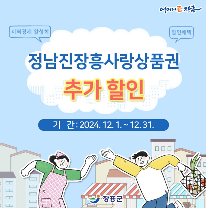 이번 추가 할인은 지난 9월 집중호우로 장흥읍, 용산면이 특별재난지역으로 지정됨에 따라, 행정안전부 재난 대응 예산을 지원받아 피해를 본 소상공인과 지역 주민 지원 및 지역경제 활성화를 위해 진행된다.