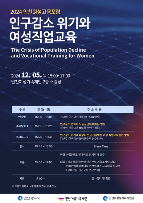 이번 포럼에서는 인구구조 변화가 노동공급에 미치는 영향에 대해 살펴보고 인구감소 위기에 대응하는 인천광역시 여성의 직업교육훈련 방향에 대해 알아본다.