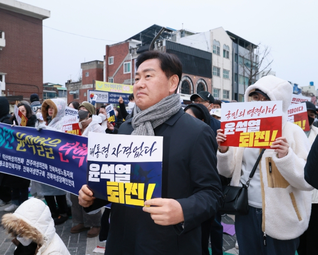 | 김관영 도지사는7일(토) 전주시 풍패지관 앞 도로에서 열린 윤석열 대통령 탄핵 시민촛불 문화제에 시민들과 함께 윤석열 대통령 퇴진 구호를 외치고 있다. |