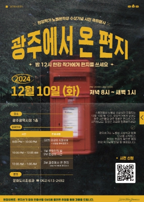 광주시는 스웨덴에서 진행되는 노벨상 시상식 일정에 맞춰 10일 밤 8시부터 다음날 새벽 1시까지 광주시청 시민홀에서 ‘광주에서 온 편지’를 주제로 ‘한강 작가 노벨문학상 수상기념 시민 축하행사’를 개최한다. 신교수 특강과 함께 재즈·샌드아트 등 다채로운 공연, 시민 500여명이 마음을 모으는 한강 작가에 축하편지 쓰기, AI로 복원된 ‘소년이 온다’의 ‘동호’의 축하인사 등 특별한 감동을 선사할 예정이다.