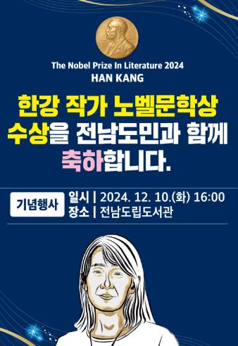 전남도는 한강 작가의 세계적 성과를 기념하고, 노벨문학상 수상의 감동을 도민들과 함께 나누기 위해 시상식 날인 10일 오후 4시 전남도립도서관에서 도민 축하행사를 개최한다.