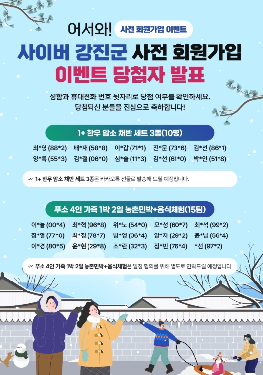 당첨자는 강진군청 홈페이지 공지사항에서 이를 확인할 수 있다.