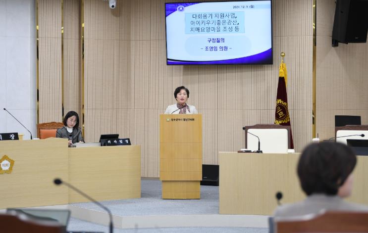 조영임 의원은 “현재 구 단위로 운영하는 다회용기지원센터를 시민들이 쉽게 접근하고 이용하도록 하기 위해서는 동별로 운영해야 한다”며 “다회용기 수거·세척 등의 사업 관련 마을형 일자리도 만들 수 있다”고 제안했다.