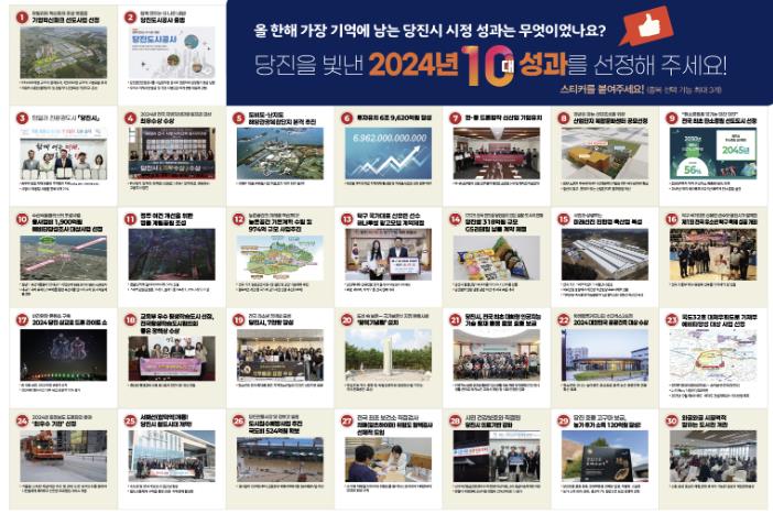 이번 투표는 당진시 누리집과 블로그를 거쳐 네이버 폼으로 참여할 수 있으며, 시민들은 제시된 30개의 성과 후보 중 가장 우수하다고 생각하는 정책 3개를 선택하면 된다.