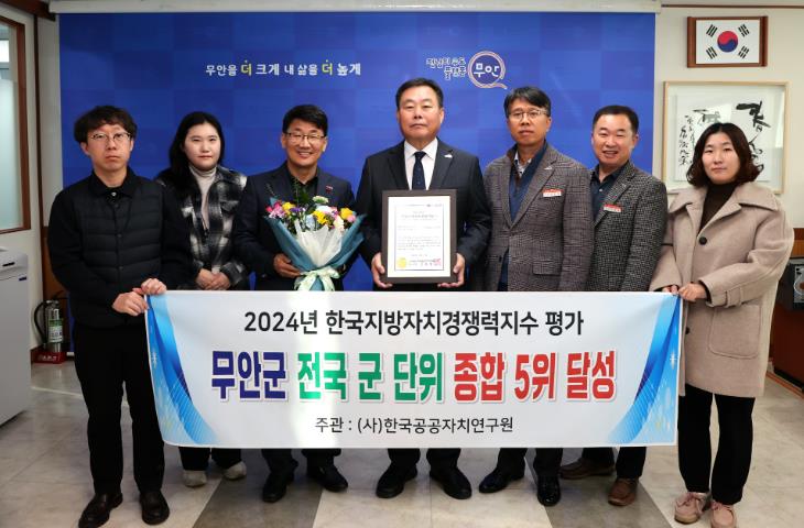 올해 이루어진 평가에서 무안군은 전국 82개 군 중에서 경영자원 부문(5위), 경영성과 부문(7위)를 달성했으며, 도내 시군 중 유일하게 전국 5위권 내에 진입했다.