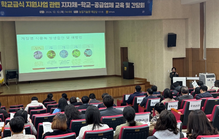 간담회는 시군, 영양교사, 공급업체 등 100여 명이 참석한 가운데 2025년 학교급식 지원사업 추진을 앞두고 식재료 위생 교육과 친환경 급식 조달 시스템 개선 안내, 관련 기관 의견 수렴 등으로 진행됐다.