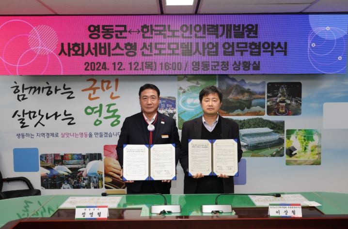 이날 협약식에는 정영철 영동군수와 이상철 한국노인인력개발원 세종충북본부장을 비롯한 관계자들이 참석했다.