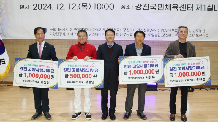 특히 이날 행사에는 강진을 사랑하고 응원하는 마음을 모아 유태경 이통장연합회 영암군 지회장, 김상현 광성타올나라 대표, 서경옥 목포한국뷔페 대표가 각 100만원, 김길남 삼성기술(주) 대표가 50만원의 고향사랑기부금을 기부해 의미를 더했다.