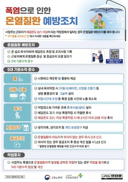 이번 점검과 교육 활동은 온열질환에 취약한 현장을 중심으로 밀폐공간 사고와 예초기 사고 우려가 높은 현장에 대해서도 점검을 실시하고, 예방 수칙과 응급조치 요령 등을 집중 교육했다.