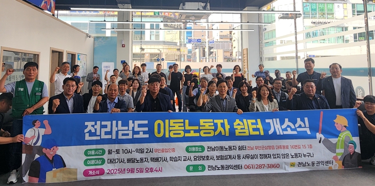 이번 전남도 이동노동자 쉼터 개소로 현재 전남에는 ▲여수시 쉼터(여수시 시청동 3길 20, 3층) ▲나주시 쉼터(나주시 상야4길, 1층) ▲강진군 쉼터(강진군 강진읍 영랑로 35, 2층 강진버스터미널 10월 초 개소 예정) 등 4개의 이동노동자 쉼터가 운영되거나 조성 중이다.