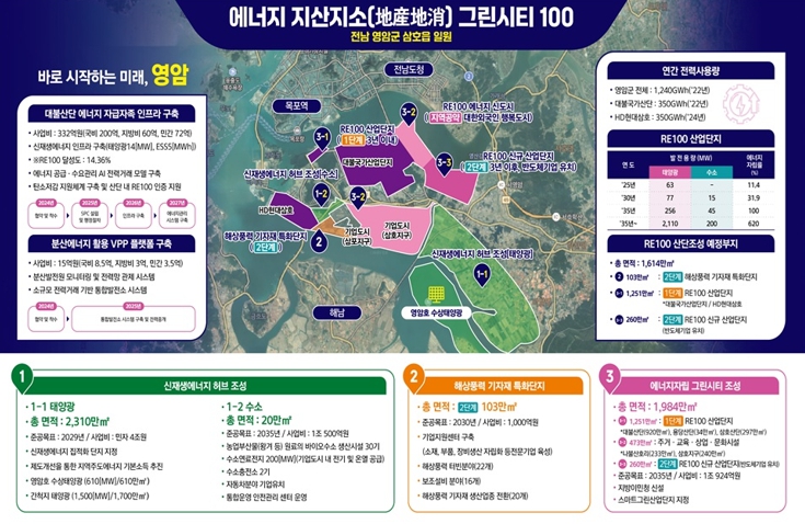 영암군은 올해 7월 ‘에너지 지산지소 그린시티 100’ 정책을 발표하고, △신재생에너지 허브-재생에너지 집적화단지 △해상풍력 기자재 특화단지 △에너지자립 그린시티를 조성하는 에너지 대전환 청사진을 밝혔다.