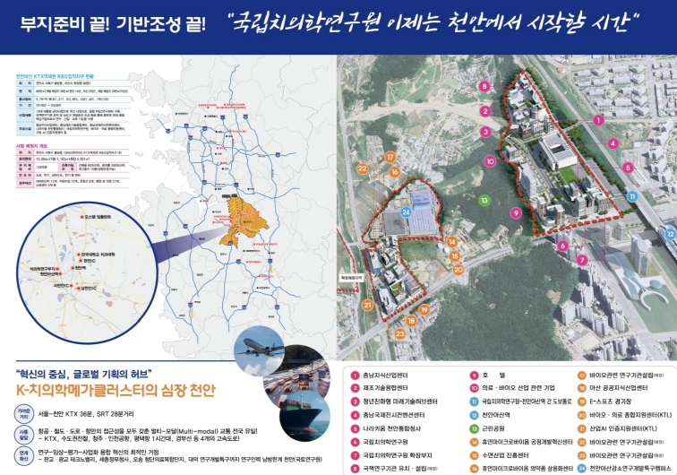 천안·아산 일대에는 단국대 치과대학병원, 순천향대병원, 단국대 치의학연구소 등이 자리잡고 있으며, 인근 오송에는 국가생명연구자원센터, 질병관리청, 식약처, 첨단의료복합단지가 위치한다.