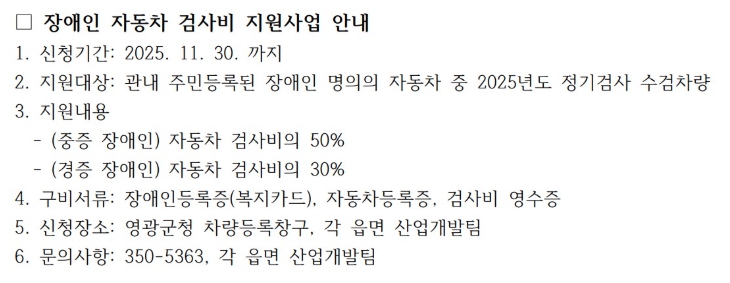 | 영광군, 장애인 소유 자동차 검사비 지원 |