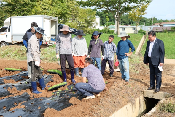 | 7일 진행한 귀농인의 집 배추 정식 실습 교육 중 김산 군수가 방문해 교육생들을 격려했다. |