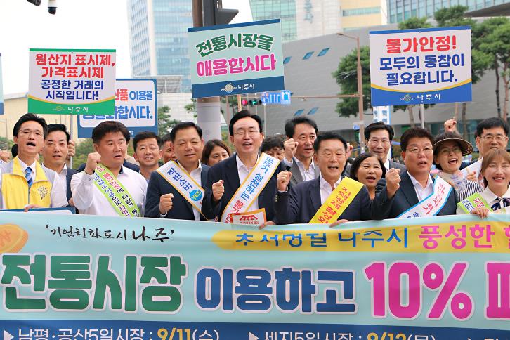 | 나주시가 오는 22일부터 ‘민생회복 소비쿠폰’ 2차 지급을 시작한다. 사진은 2024년 추석 맞이 지역상권활성화 동참 캠페인 모습. |