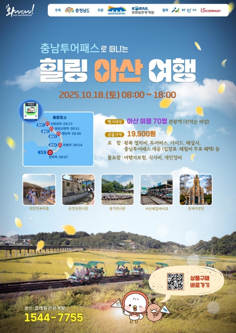 해당 상품은 아산시, 코레일관광개발과 협력해 서해선 열차 왕복 티켓과 충남 투어패스, 아산 시티투어버스를 결합한 상품으로 지난 7월 26일 1회차 운영의 큰 호응을 계기로 더욱 알찬 코스로 2회차를 추진한다.