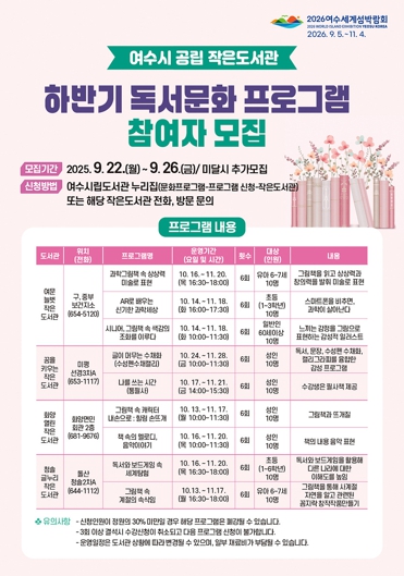 | 여수시 공립 작은도서관 ‘2025년 하반기 독서문화 프로그램’ 수강생 모집 홍보문 |