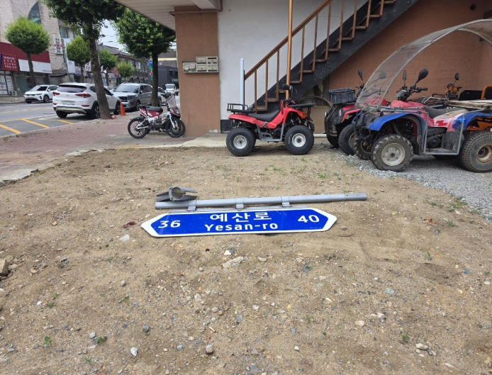 | 훼손된 도로명판이 바닥에 떨어져 있는 모습 |