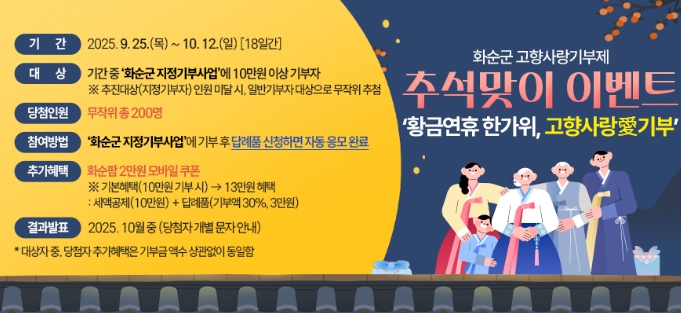 화순군은 이번 이벤트를 계기로 고향사랑기부제가 군민 행복과 지역 발전의 기반으로 정착될 수 있도록 홍보와 참여 확대에 더욱 힘쓸 계획이다.