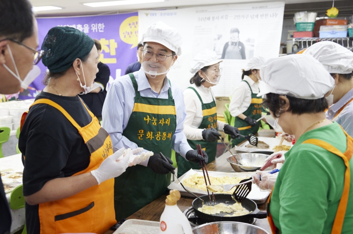 시흥시 체육관에서 ‘나눔자리문화공동체’와 함께한 김 지사는 봉사자들과 동태전을 부치고, 반찬을 소분해 담는 작업에 참여했다. 이어 30여 년간 지역 취약계층을 위해 꾸준히 활동해 온 나눔자리문화공동체 이상기 회장에게 도지사 표창을 수여했다.