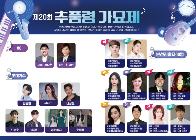 재단 관계자는 “추풍령 가요제는 신인 가수들의 발판이자 군민과 방문객이 함께 즐기는 축제의 장”이라며 “본선 참가자들의 끼와 열정, 초대 가수 공연, 그리고 전문 사회자의 진행까지 어우러져 최고의 무대가 될 것”이라고 전했다.