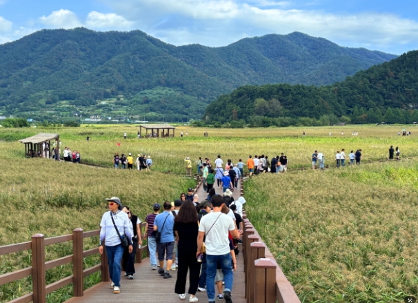 | 추석 연휴 순천만습지를 찾은 방문객들이 가을 정취 속에서 갈대밭 산책을 즐기고 있다 |