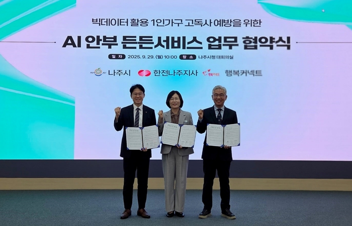나주시(시장 윤병태)는 최근 한국전력공사 나주지사, SK재단법인 행복커넥트와 함께 1인 가구 사회안전망 강화를 위한 ‘AI안부 든든서비스’ 3자 업무협약을 체결하며 민관공이 함께하는 통합형 사회안전망 구축에 나섰다고 11일 밝혔다.